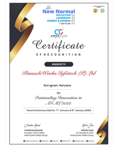 Awarded for Outstanding Innovation in AI-ML 2021 during the New Normal Education, Leadership, Summit and Awards organised by Ardorcomm Media